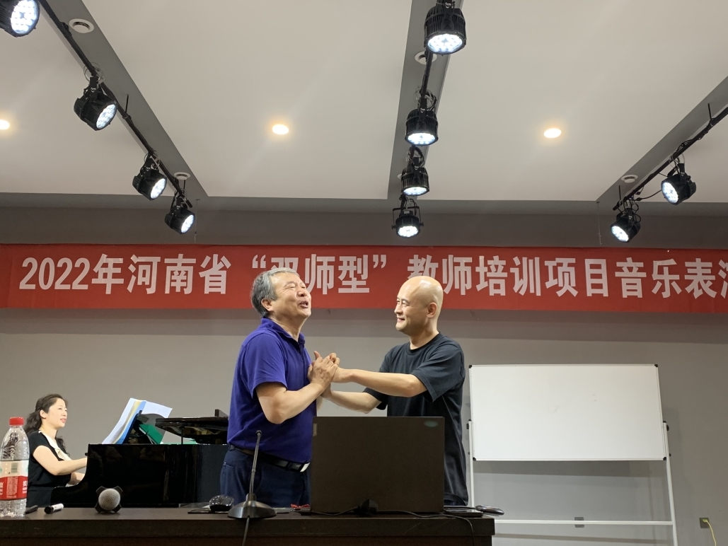 在授课过程中,李新现教授结合自己对声音美的理解,以《在那遥远的地方》等歌曲选段和不同歌唱家演唱范本为例,为全体学员示范如何通过声音表达歌曲情感,加深学员对歌唱的理解。为了能更加直观的帮助学员们解决问题,李新现教授现场一对一授课。针对个体的不同问题,耐心指出症结并做出示范指导。经过李新现教授的点拨指导,学员的声音质感得到改善,对歌唱表演时腔体的应用、感情的色彩处理等问题有了更加深刻的领悟。